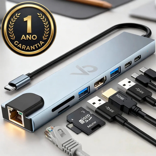 Adaptador Hub Usb Com 8 Portas Rj45 Hdmi Usb 3.0 E 2.0 Tipo C Micro Sd Cartão Ethernet Cabo Thunderbolt Dock Station Dex Macbook Air M1 M2 iPad Type C Tablet Computador Pc Notebook Extensor Voxo