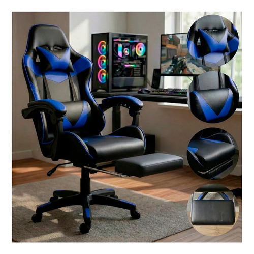 Cadeira Escritório Gamer Ergonômica Reclinável Com Apoio dos Pés Em Couro Azul Led Tools
