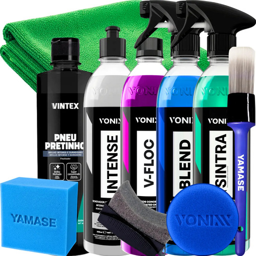 Kit Vonixx com V-Floc, Blend selante, Sintra Intense para plásticos internos e produtos complementares de detalhamento.