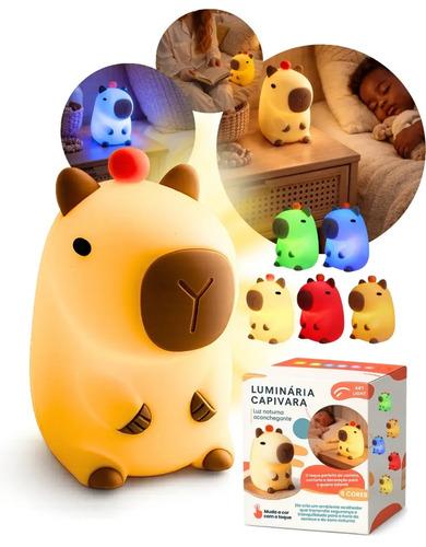 Luminária infantil em silicone macio no formato de capivara com toque touch, luz noturna recarregável que muda de cor.