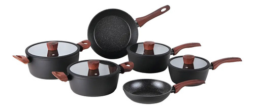 Jogo Mimo Style Cook com 10 peças em alumínio com cerâmica e cabos de madeira, fundo triplo para indução.