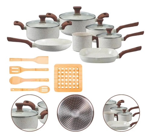 Jogo de panelas de cozinha Mimo Style Cook Fundo de Tripla Indução com 10 peças de alumínio, cerâmica, madeira marmol vanila