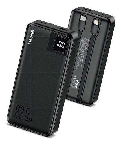 Powerbank Basike 20000mAh preto com cabos embutidos, USB-C, display e carga rápida de 22.5W.